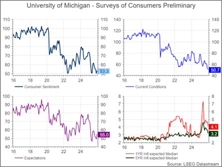 As of September, both headline and core CPI were running at 3.0% year over year—above the Fed’s 2% target, but well short of the feared tariff-driven inflation shock. Disinflation in energy prices and shelter costs, two large components of CPI and PCE, helped offset tariff pressures. Inflation expectations have since moderated, with University of Michigan survey data showing a marked pullback from the post-tariff announcement highs.