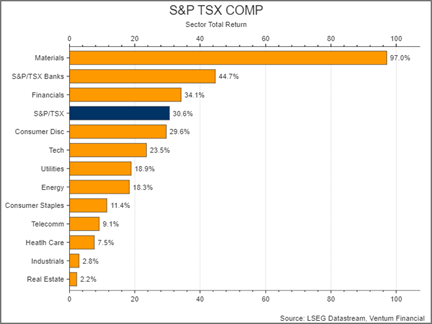 Canadian equity performance in 2025 was led decisively by the S&P TSX Materials sector, which delivered a total return of approximately +97%, far outperforming all other sectors. This exceptional result reflects the sector’s heavy exposure to gold producers, which benefited from strong investor demand for inflation and geopolitical hedges amid elevated global uncertainty.