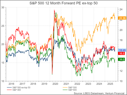 While index-level valuations have reached their highest levels since the dot-com era, this risk is highly concentrated. Excluding the largest 50 companies, the remaining 450 constituents are trading at valuation multiples much closer to their mid- and small-cap peers and more in line with long-term historical averages. Valuations are elevated overall, but we believe the most extreme risks are concentrated in the largest U.S. companies.