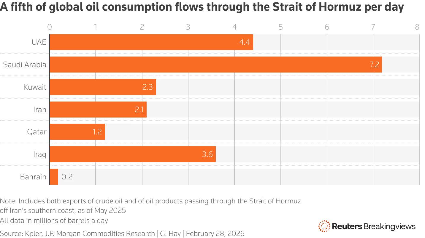 The oil market reaction was grounded in the strategic importance of the Strait of Hormuz. Roughly one-fifth of global crude oil consumption transits this chokepoint each day, with major producers including Saudi Arabia (≈7.2 mmb/d), the UAE (≈4.4 mmb/d), Iraq (≈3.6 mmb/d) and Kuwait (≈2.3 mmb/d) relying on uninterrupted flows.
