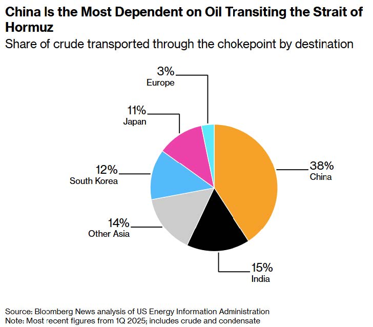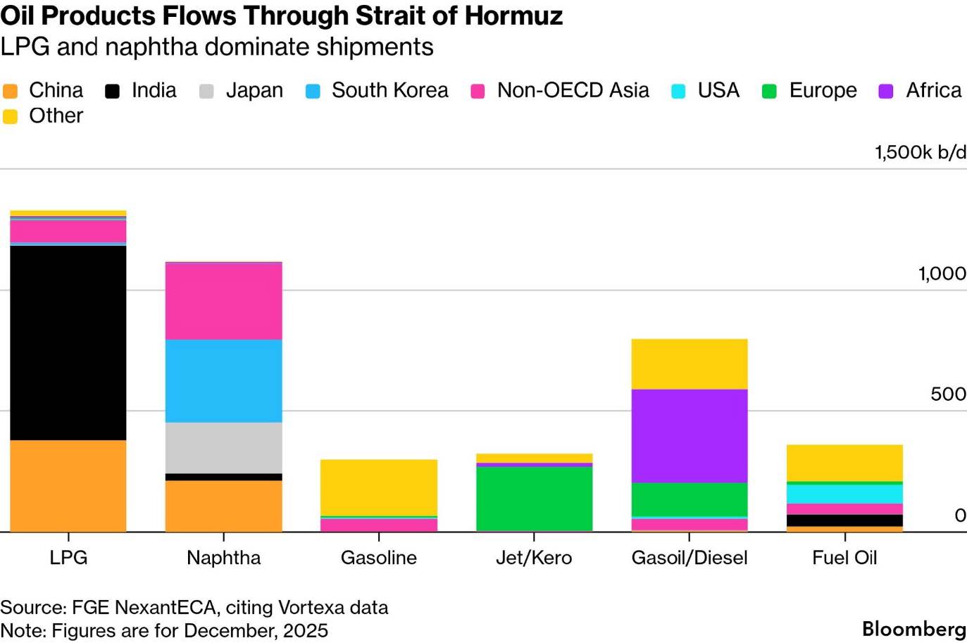 According to Bloomberg, a significant share of that crude ultimately fuels East Asian demand — notably China (≈38%), India (≈15%), South Korea (≈12%) and Japan (≈11%) — underscoring how disruptions can reverberate through global energy balances.
