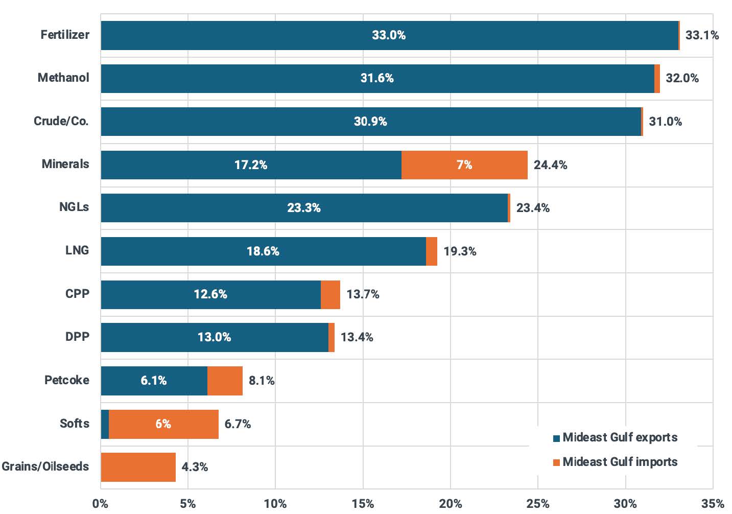 Moreover, the Middle East Gulf plays a critical role in global petrochemical and fertilizer trade. Roughly one-third of global exports of fertilizers, methanol, and crude oil products originate from the region, alongside meaningful shares of LNG and natural gas liquids. This underscores that a disruption would not only pressure crude benchmarks like WTI and Brent, but could also tighten markets for agricultural inputs, industrial chemicals, and energy-intensive materials — broadening the inflationary channel beyond gasoline into food production and core goods.