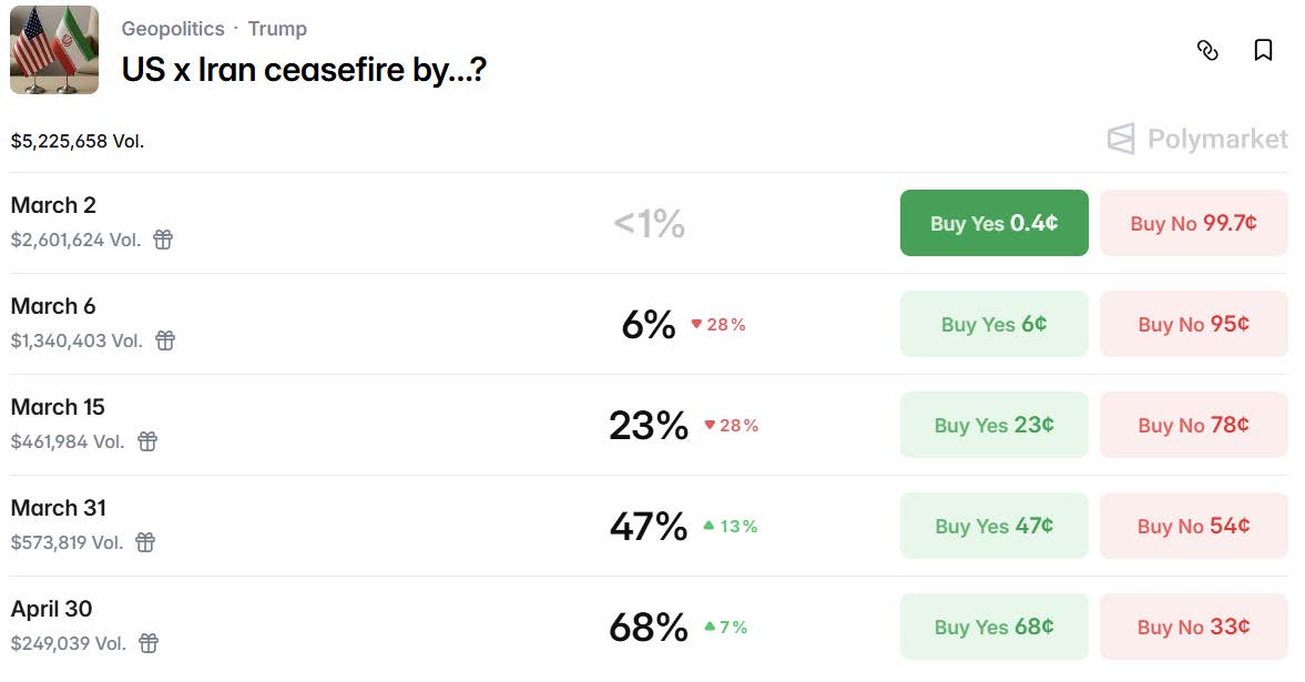 On the broader geopolitics front, market-based probability indicators show increasing expectations of a negotiated ceasefire later this month or into April, with a rapid shift from sub-1% odds earlier in March toward a majority probability of de-escalation by late April.