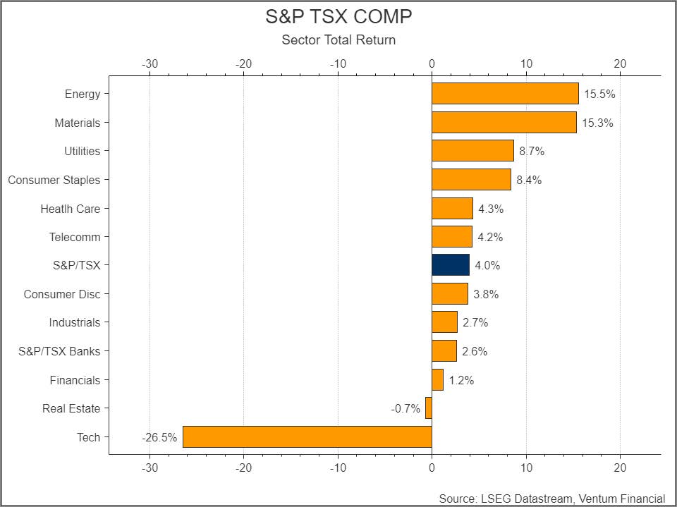 Despite the volatility in gold, Canada’s Materials sector has posted a solid gain of +15.3% YTD, benefiting from continued investor preference for real-asset exposure and commodity-linked earnings resilience.