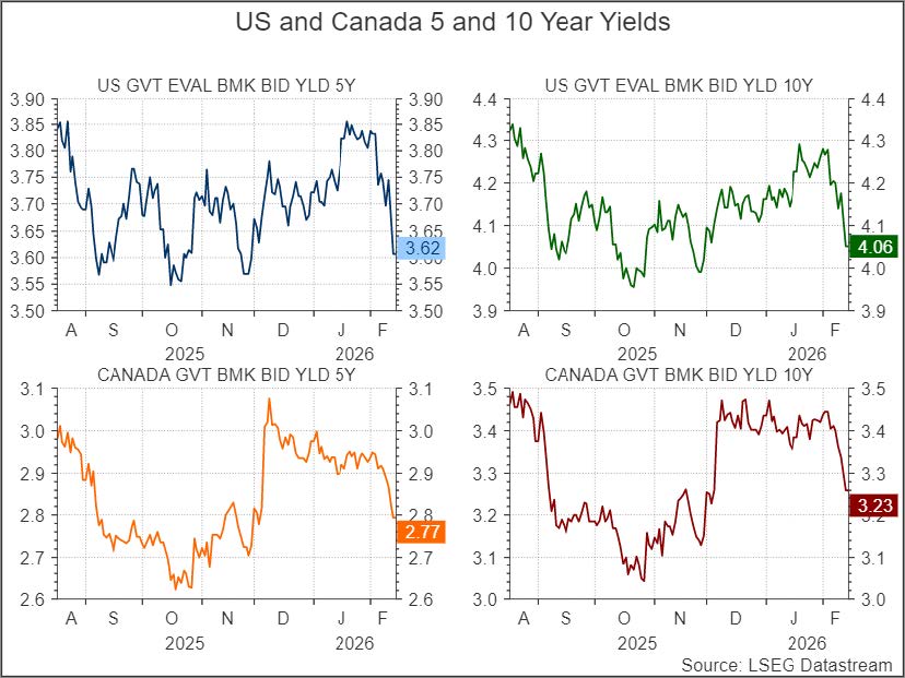 Equity performance underscores this resilience. Among the three major U.S. indices, the cap-weighted S&P 500 remains roughly flat year to date, while the Dow Jones Industrial Average has gained 3.06%. By contrast, the technology-heavy Nasdaq has declined -2.05% YTD. The equal-weighted S&P 500, however, has advanced 5.5%, highlighting notable dispersion beneath the headline index level. In Canada, the resource-heavy S&P/TSX Composite Index has gained 3.74% YTD.