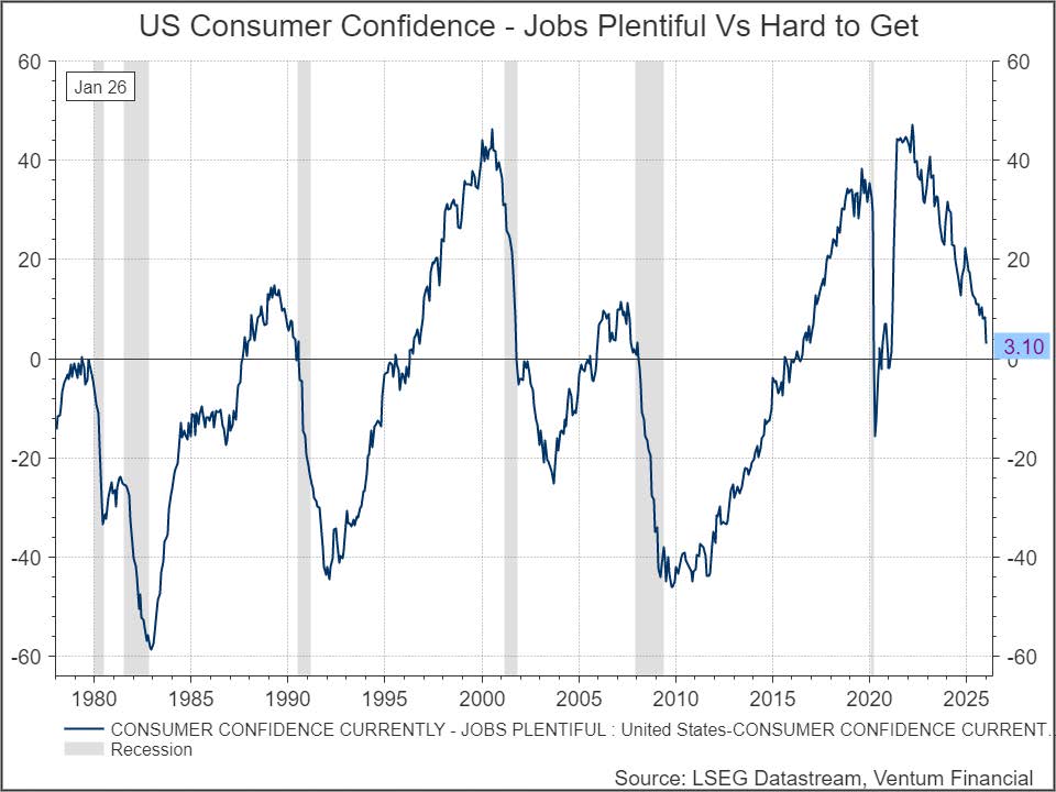 Labor force participation among individuals aged 55 years and older has declined from 40.5% in 2019 to 37.9% in January 2026, with the downward trend still intact. This pattern points to a growing preference for early retirement, occurring alongside household wealth levels that remain near all-time highs. Together, these dynamics have helped stabilize aggregate demand despite softer employment trends.