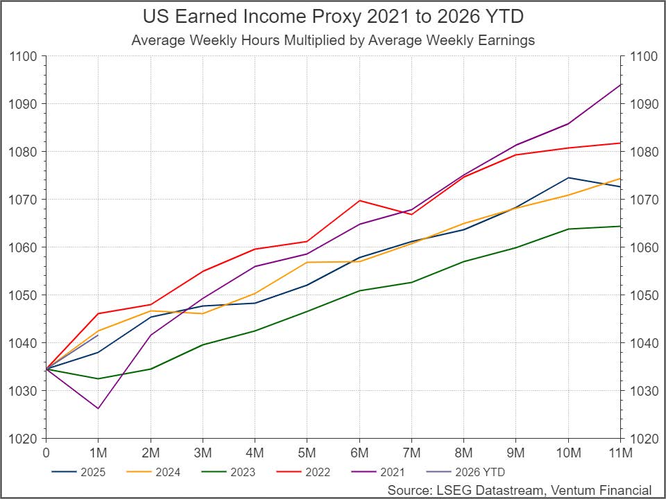 Consumption should continue to demonstrate resilience. The household earned income proxy we monitor — calculated as average weekly hours multiplied by average weekly earnings — remains at a pace near the high end of 2021 and 2022 levels, despite a modest decline in December. While labor market conditions have softened, rising real wages should help sustain aggregate consumption.