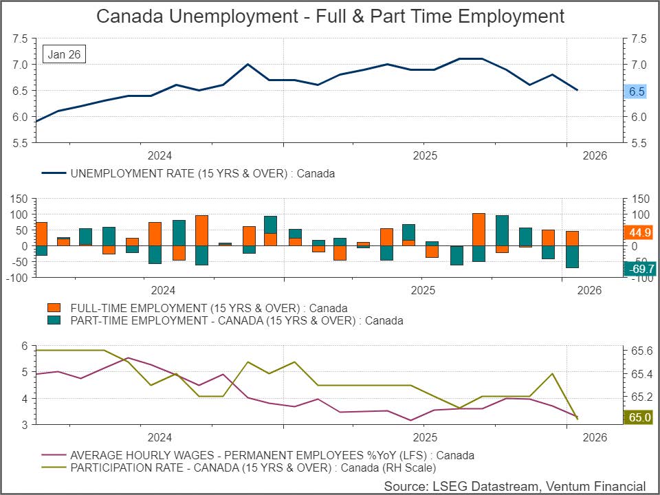 This apparent improvement contains important nuance. December also saw a sharp contraction in Canada’s labour force of 119K, representing the largest one-month decline in the post-COVID period, as temporary workers departed the country in significant numbers.