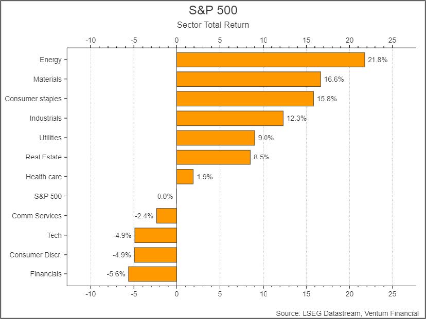 Equity market leadership has shifted meaningfully, with sector performance increasingly reflecting a defensive and real-asset-oriented rotation. The S&P 500 index remains flat year to date, masking significant dispersion beneath the surface. Energy and Materials have emerged as clear outperformers, advancing +21.8% and +16.6%, respectively. At the same time, traditionally defensive segments such as Consumer Staples and Utilities have generated solid gains. In contrast, cyclically sensitive and long-duration growth sectors have lagged, with Financials declining -5.6% and Information Technology -4.9%.