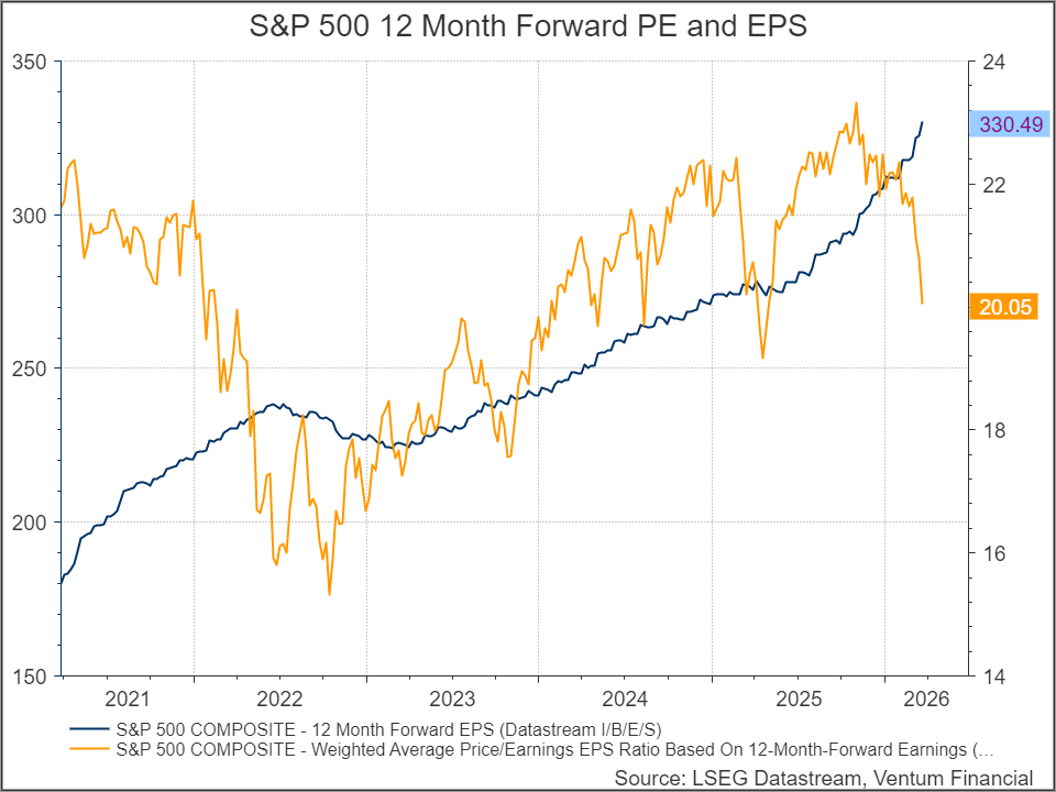 But it is worth being precise about what is actually falling here. This is, at its core, a decline in investor sentiment — a compression of the premium that markets were willing to pay for future earnings — rather than a deterioration in the earnings estimates themselves. The S&P 500’s forward price-to-earnings multiple has retreated from its peak of over 23 times to just around 20 times. That is a meaningful re-rating, and it explains much of the index-level pain. Investors are paying less for each dollar of future profit, not because those profits are disappearing, but because uncertainty has a price.