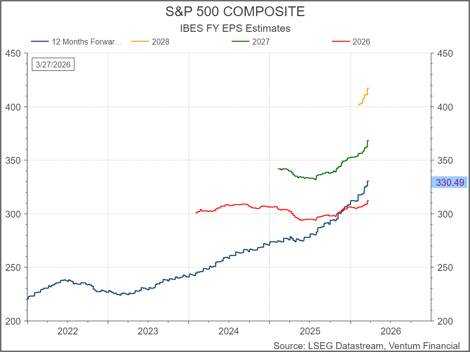 And the profits, for now, are holding up remarkably well. The twelve-month forward EPS level sits at $330.49 — a figure that has risen steadily and with remarkable consistency since 2022, barely flinching in the face of the current turbulence. Full-year estimates for 2026 sit near $311, with 2027 already pencilled in above $365 and 2028 approaching $415.