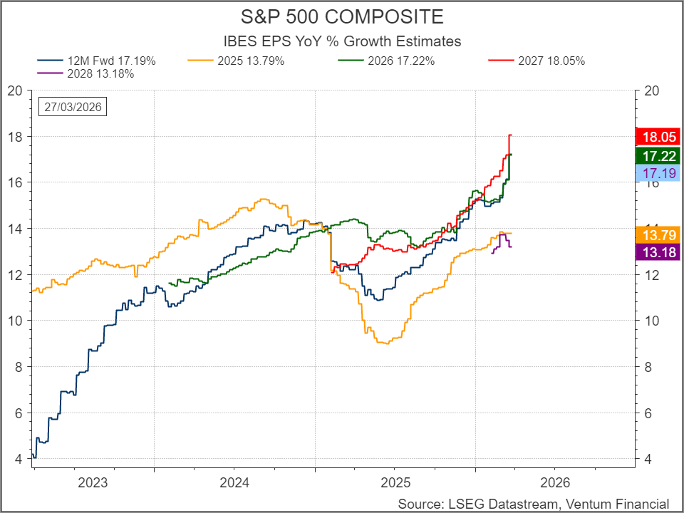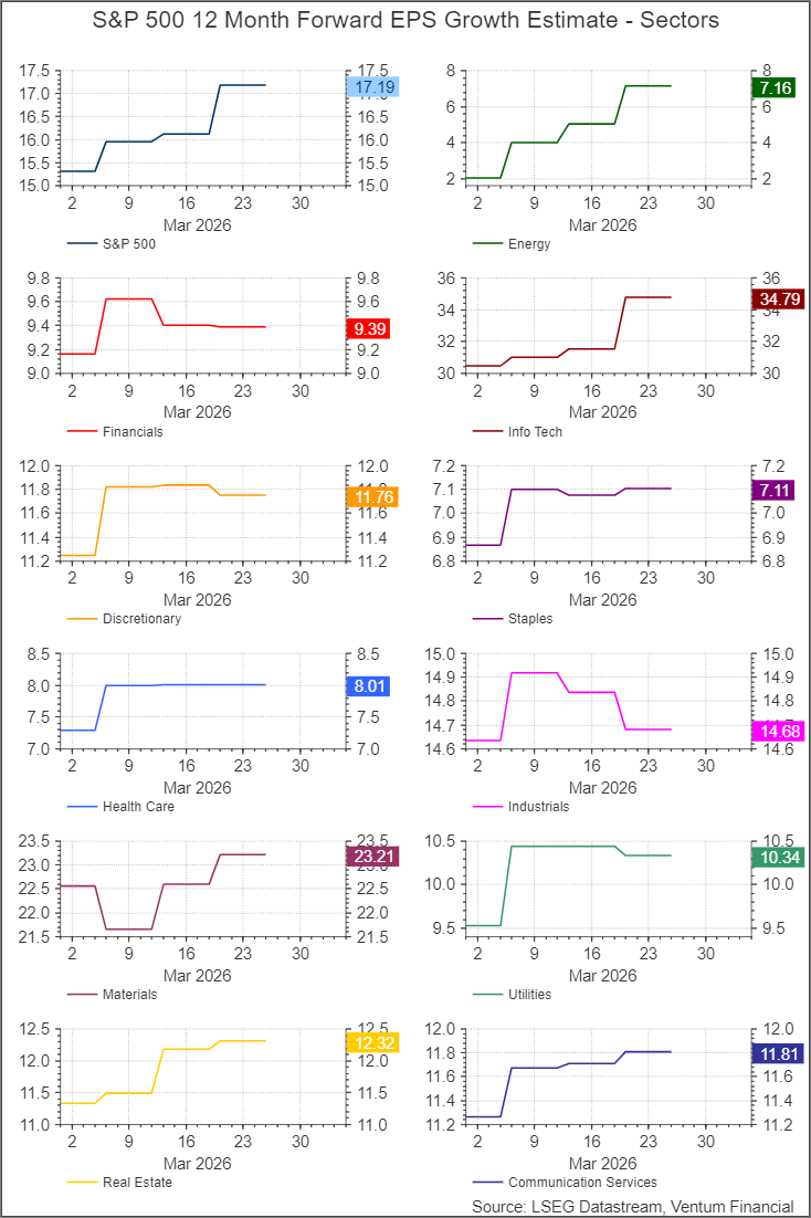 The trajectory is not just high — it is accelerating. Twelve-month forward EPS growth is now running at over 17%, its strongest pace since 2020.